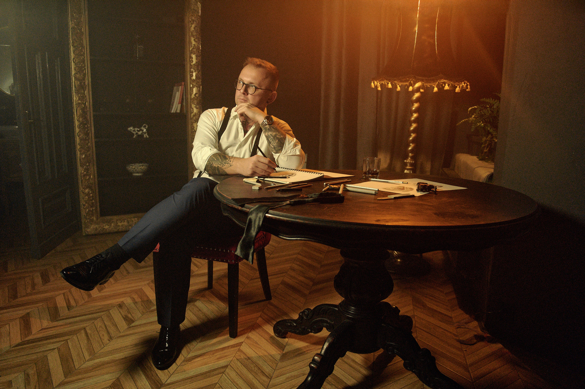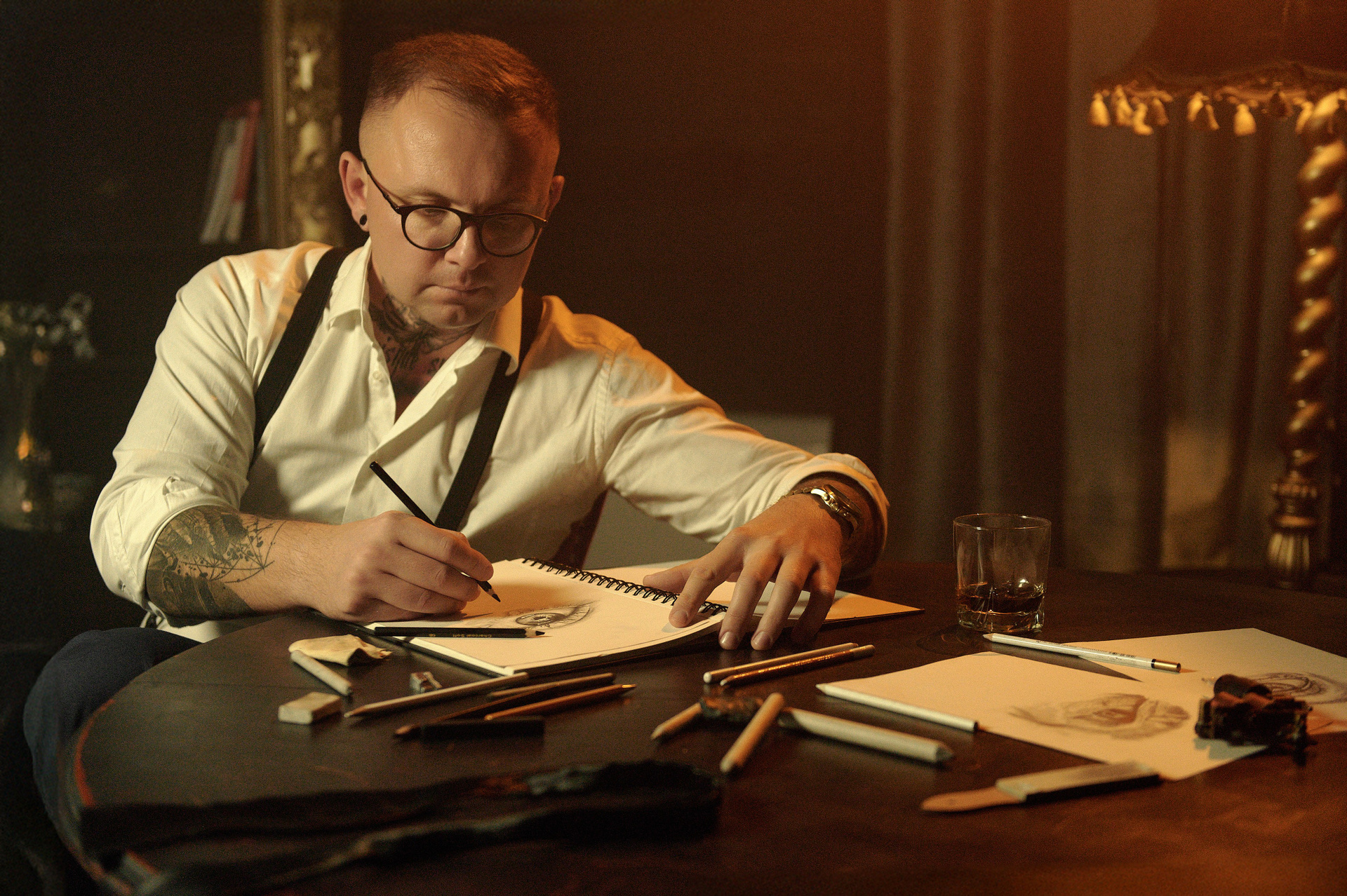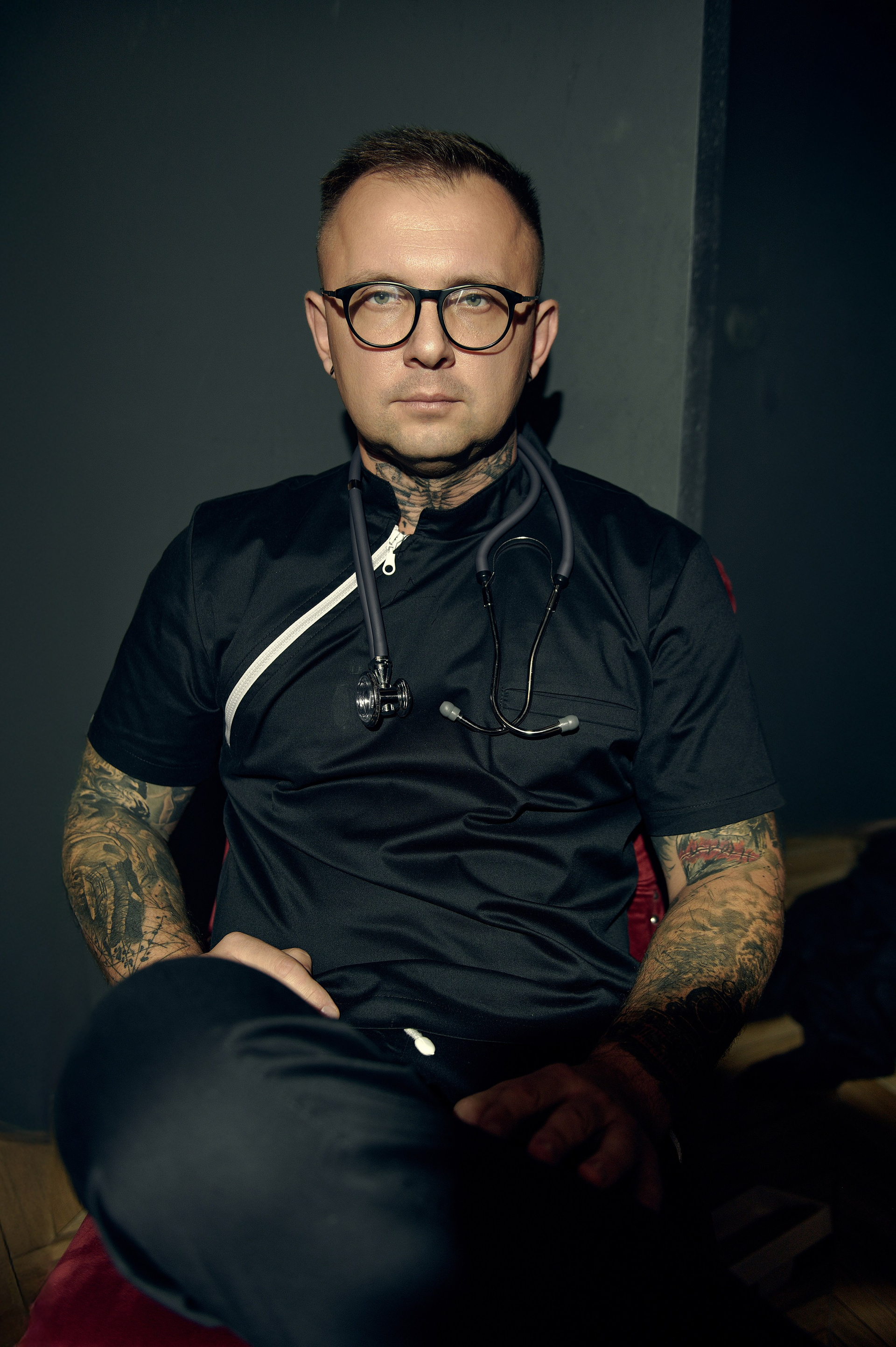 Również Rafał chciał żeby w sesję były wlecione jego zainteresowanie rysowaniem oraz coś z zawodu pielengniarza. Żeby nie robić „jak u wszystkich”, delikatnie dodaliśmy takie detale jak stetoskop czy książki medyczne, jednak postarałem się zrobić tak, żeby nie dominowały one w kadrze. Oraz zrobiliśmy kilka bardziej klasycznych zdjęć portretowych w ubraniach medycznych.
